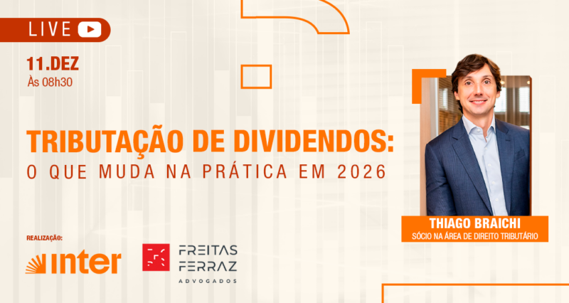 Nesta quinta-feira, 11/12, às 8h30, nosso sócio da área de Direito Tributário, Thiago Braichi, participa de live promovida pelo Banco Inter ao lado de Bernardo Pissolati, Estrategista de Investimento da instituição.
